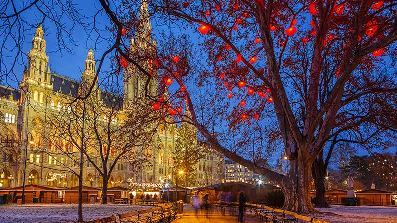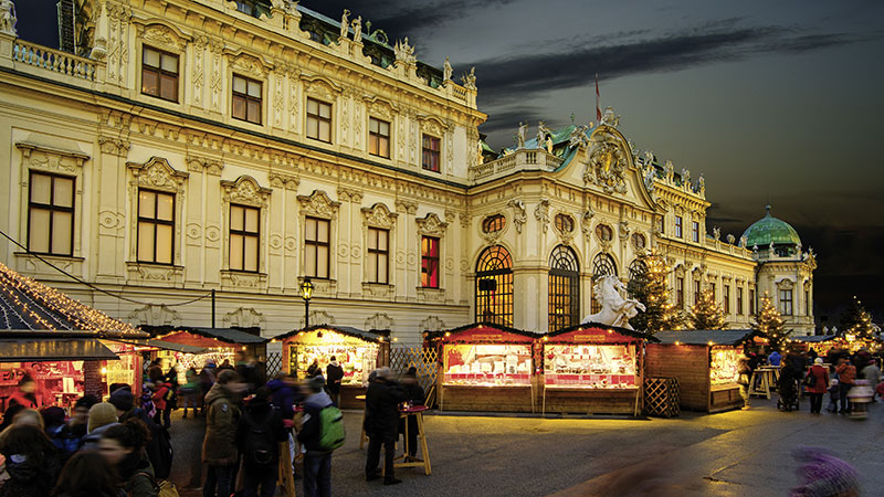 I førjulstiden forvandles Wien til en stemningsfull juleby med glitrende lys, duften av glühwein og tradisjonsrike julemarkeder på nesten hvert torg. Byens mest berømte marked ligger foran Rådhuset. En stor, lysende portal ønsker besøkende velkommen til det tradisjonelle markedet. Her kan du la deg friste av kunsthåndverk, julepynt, kulinariske godbiter og selvfølgelig glühwein. Et roligere og mer stemningsfullt marked finner du ved Belvedere-slottet, der det praktfulle barokkpalasset danner en elegant bakteppe til markedsbodene. Avslutt gjerne besøket i Wien med å smake på lokale spesialiteter som Sacher-torte eller apfelstrudel på et av byens mange elegante konditorier.